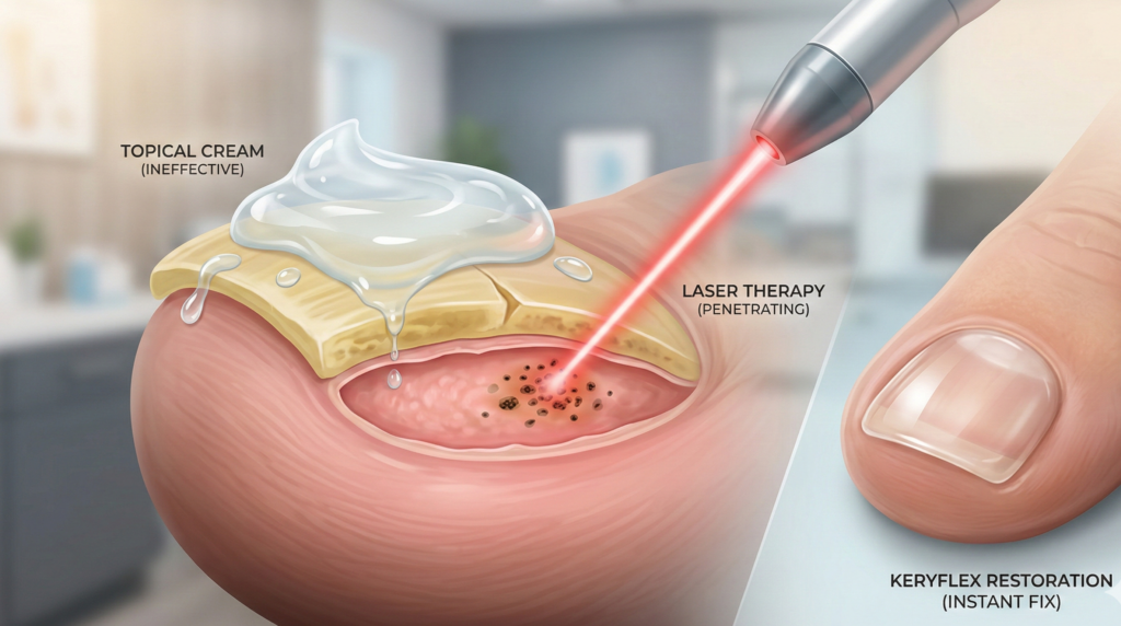 Most over-the-counter (OTC) treatments fail not because the medicine is bad, but because it simply cannot reach the infection. Here is the science behind why drugstore creams don’t work—and the medical technology that actually does.